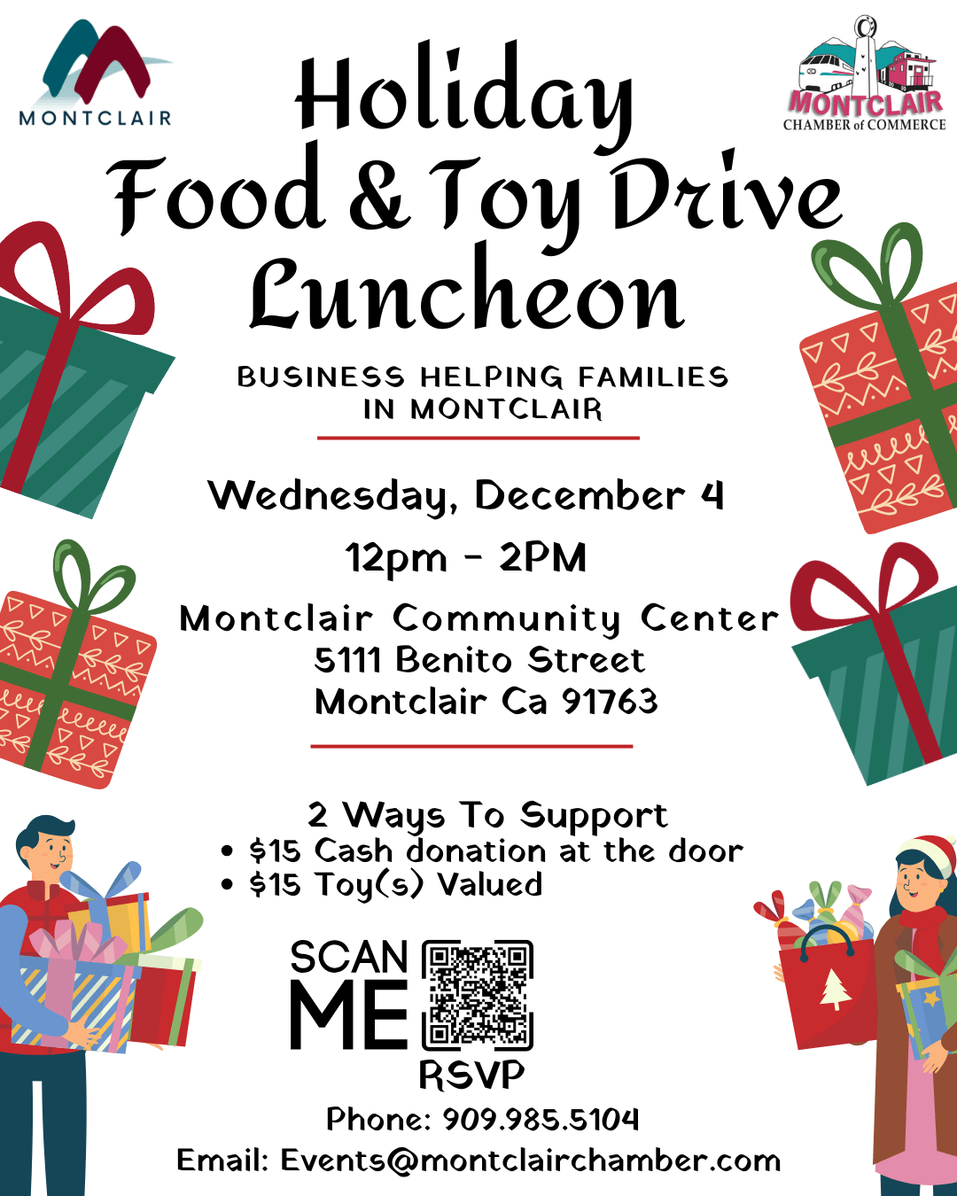The Montclair Chamber of Commerce is proud to partner with the City of Montclair for their annual Holiday Food & Toy Drive Program. The Chamber encourages the chamber members, general public, and families to attend this luncheon to network, connect with other businesses, and support this great cause. A $15 donation is encouraged at entry of door. Lunch will be served at the event with refreshments.